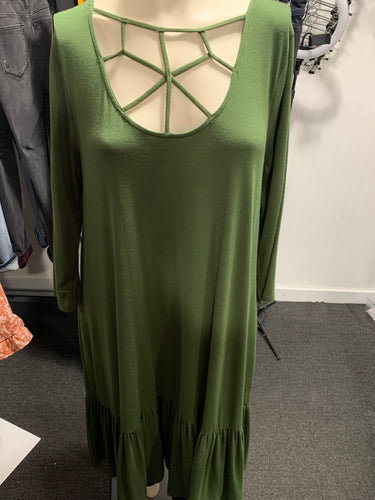 306 Viscose 3/4 web detail front ruffle hem dress with side pockets